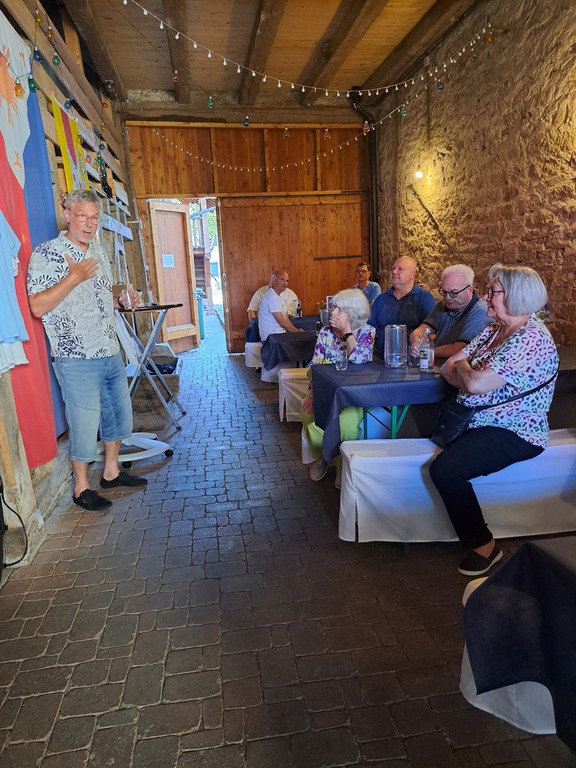 Hans Baur ging in der, mit 40 Personen, voll besetzten Scheuer auf die Historie und Entwicklung des Weinguts ein. Gestartet wurde mit einem herrlich erfrischenden Secco, auf den Rivaner, Burgunder und Muscaris folgten. Nachdem auf den Tischen die Vesperteller verteilt waren, widmeten wir uns den „Roten“.
